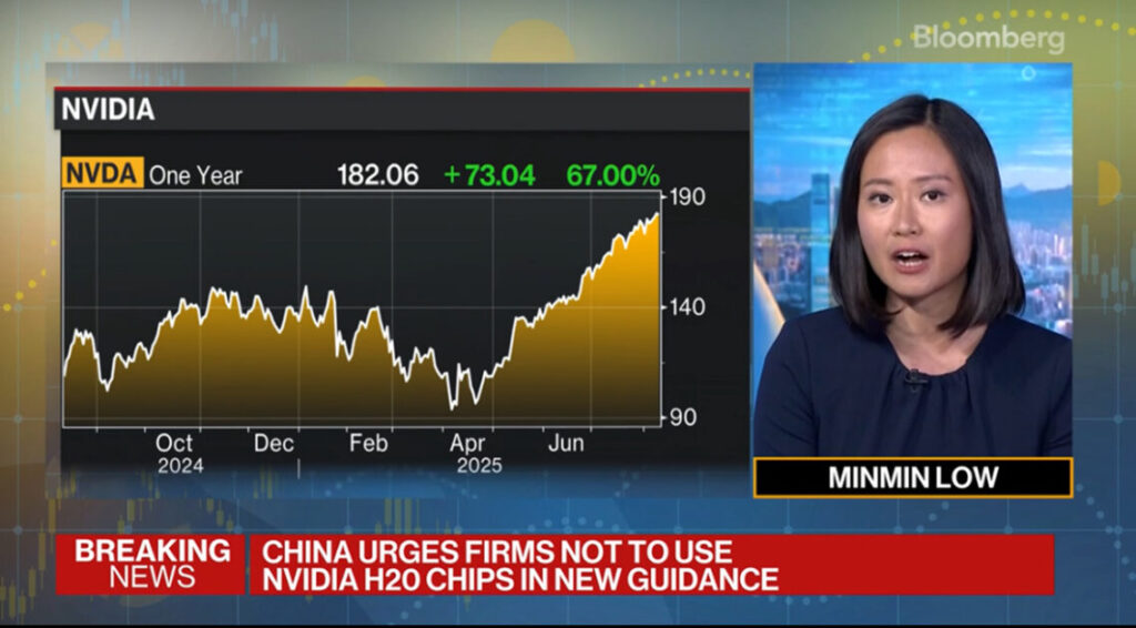 1: ばーど ★ 2025/08/12(火) 21:54:46.73 ID:mnQwWFTz ■中国、エヌビディアH20製品使用控えるよう要求-企業向けに新指針・中国当局は使用をやめるよう求める通達をさまざまな企業に送付した ・中国半導体株が大幅上昇、上海市場で中科寒武紀科技はストップ... -