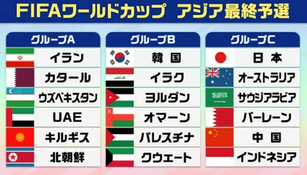 1: 阿弥陀ヶ峰 ★ 2024/06/27(木) 17:21:13.70 ID:SPyH7W1x9 6月27日、2026年北中米ワールドカップ・アジア最終予選の組み合わせ抽選会がマレーシアのクアラルンプールで行なわれ、以下のように組分けが決定した。 抽選の結果、日本はグループCに入り、オ... -