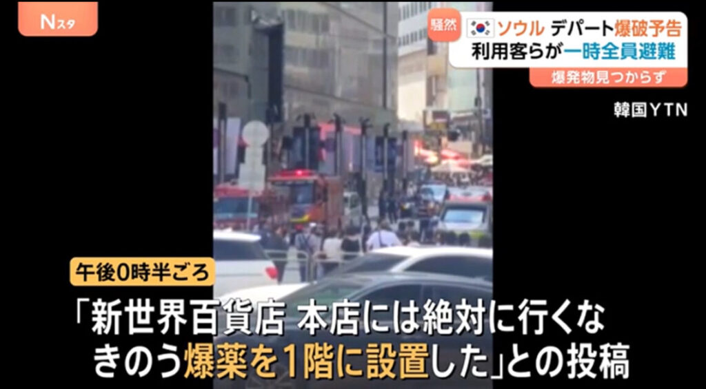 1: ばーど ★ 2025/08/05(火) 21:30:37.48 ID:hUBy0CQe 韓国・ソウルの中心部にあるデパートに爆発物を設置したとする脅迫文がインターネットサイトに掲載され、利用客ら4000人が一時、避難する事態となりました。韓国メディアによりますと午後0時半ごろ、... -