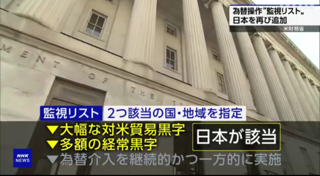 アメリカ財務省 日本を為替操作「監視リスト」対象に指定