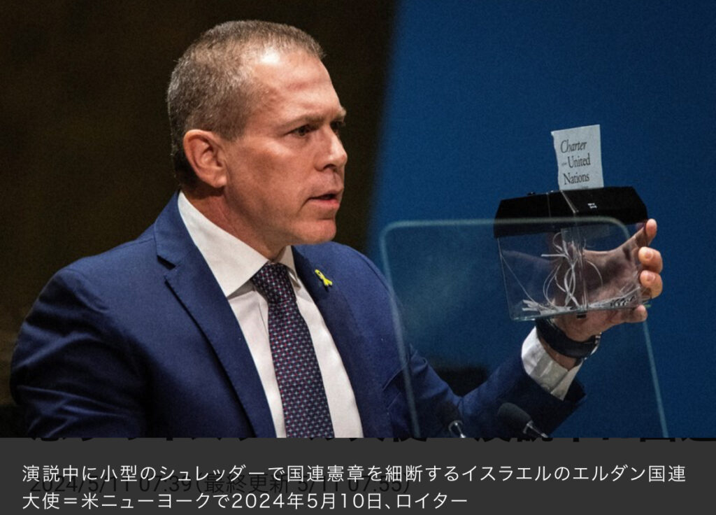 1: 朝一から閉店までφ ★ 2024/05/11(土) 11:57:35.88 ID:UfVw+Wgj 毎日新聞 2024/5/11 07:39(最終更新 5/11 07:55) イスラエルのエルダン国連大使は10日、国連総会の壇上でパレスチナの加盟を支持する決議案に反対する意思を示すため、小型のシュレッ... -