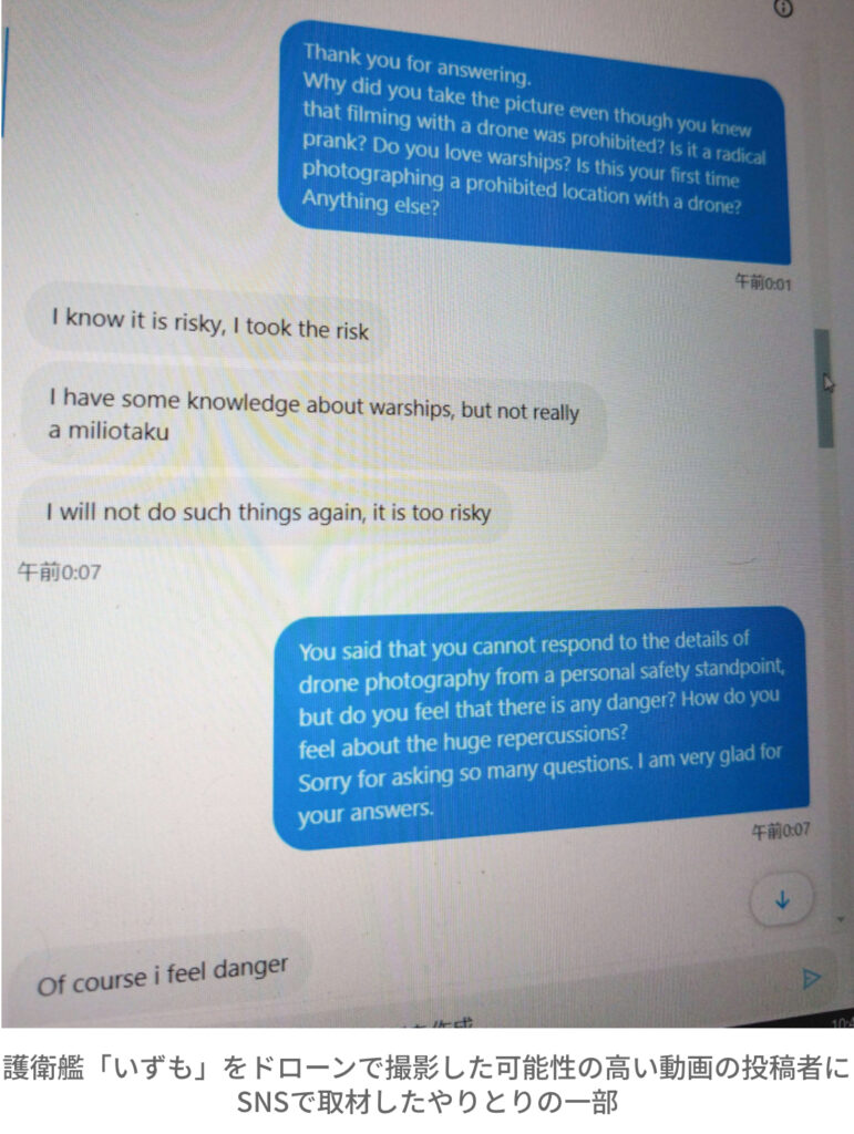 1: 牛乳トースト ★ 2024/05/10(金) 18:05:00.86 ID:ZiknVcuE9 海上自衛隊のヘリコプター搭載型護衛艦「いずも」をドローンで撮影した可能性の高い動画がSNSに投稿された問題で、動画を投稿した人物が10日までにSNSを通して取材に応じ、撮影に際して「妨害... -
