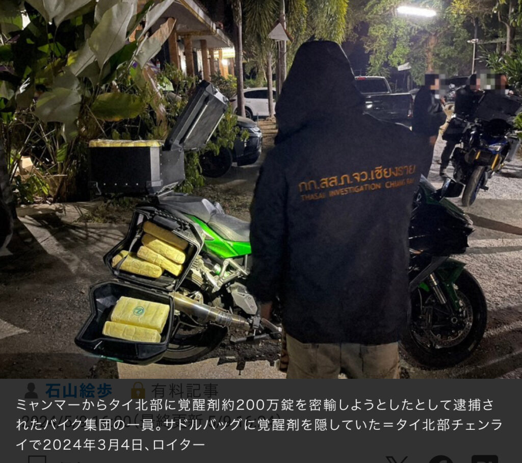1: 影のたけし軍団 ★ 2024/05/09(木) 16:31:11.83 ID:??? TID:gundan ミャンマー国軍のクーデター以降、無法地帯と化した北東部シャン州で違法◯物の製造量が急増している。隣国タイに流れ込む錠剤型覚◯剤の末端価格は1錠35バーツ(約147円)まで暴落した。... -