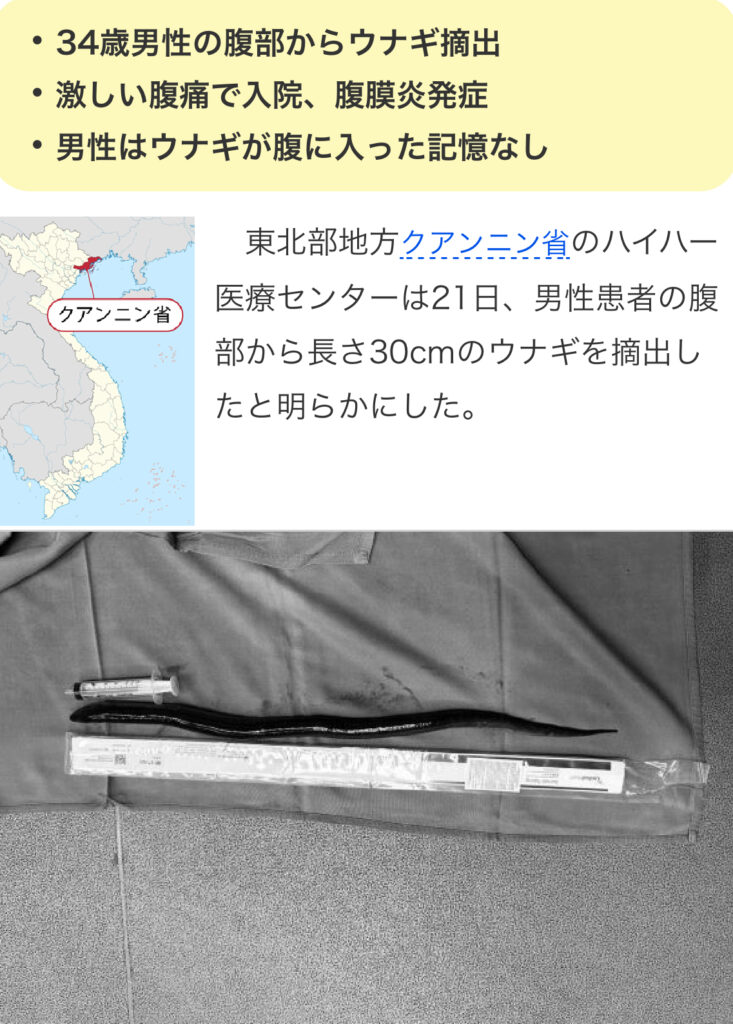 1: 名無しさん@涙目です。(みょ) [GB] 2024/03/29(金) 16:31:29.20 ID:UH8qBv0B0 BE:595582602-2BP(3745) sssp://img.5ch.net/ico/anime_shii03.gif クアンニン省:男性の腹部から長さ30cmのウナギを摘出 2024/03/22 15:50 JST配信 https://www.viet-jo.c... -