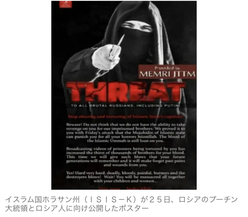 1: KOU ★ 2024/03/28(木) 01:01:36.47 ID:??? TID:kougou ロシアがモスクワのコンサートホールテロの容疑者らを残酷に拷問した映像を公開し、テロの背後を自任するイスラム武装勢力のイスラム国(IS)が反発し報復を予告した。ISの分派であるイスラム... -