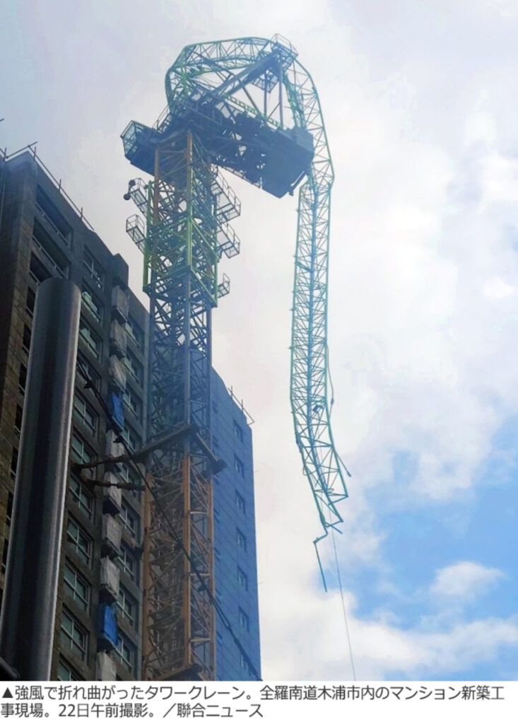 【朝鮮日報】 時速89キロの強風で工事現場のタワークレーンがグニャリ /全羅南道