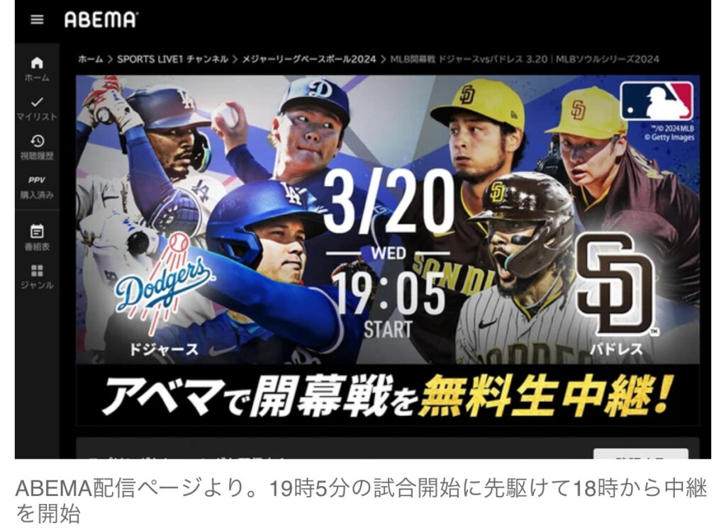 1: jinjin ★ 2024/03/20(水) 19:01:09.17 ID:1xEiClIw9 MLB開幕戦「ドジャースvsパドレス」、テレビはNHK/ネットはNHKプラスとABEMAで無料中継 3月20日(水・祝)に開幕する野球・メジャーリーグベースボール(MLB)。 大谷翔平ら日本人選手の出場も期待... -