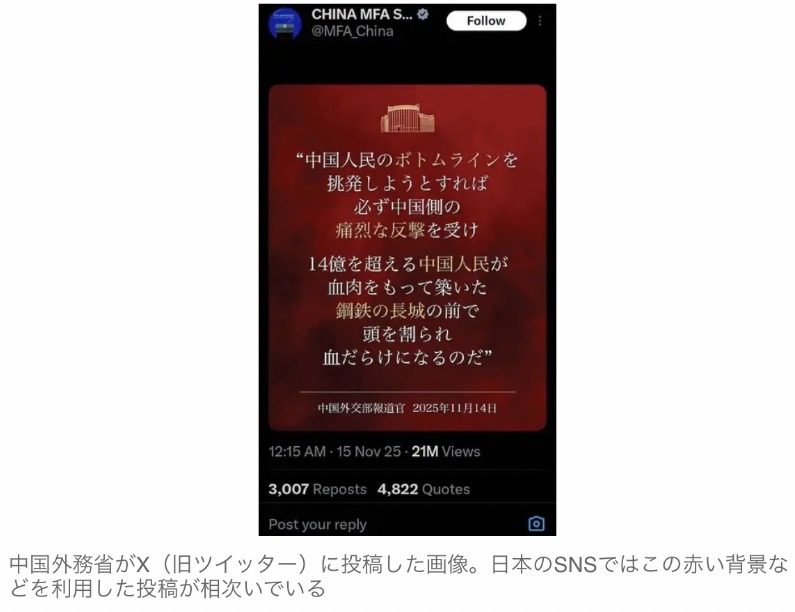 1: ♪♪♪ ★ 2025/11/21(金) 00:06:00.63 ID:wds+I+mc9 中国外務省がX(旧ツイッター)に投稿した画像。日本のSNSではこの赤い背景などを利用した投稿が相次いでいる 高市早苗首相が台湾有事は「存立危機事態」になり得ると国会答弁したことを巡り、中国側がX... -