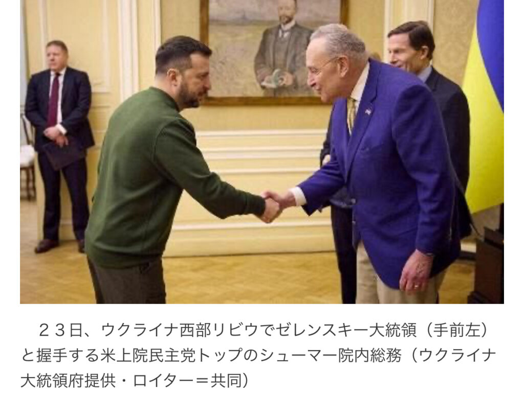 1: コバーン ★ 2024/02/24(土) 10:36:34.81 ID:??? TID:cobain ウクライナのゼレンスキー大統領は23日、西部リビウで米上院民主党トップ、シューマー院内総務ら米議員団と会談し、追加の軍事支援を要請した。シューマー氏によると、ゼレンスキー氏は「米... -