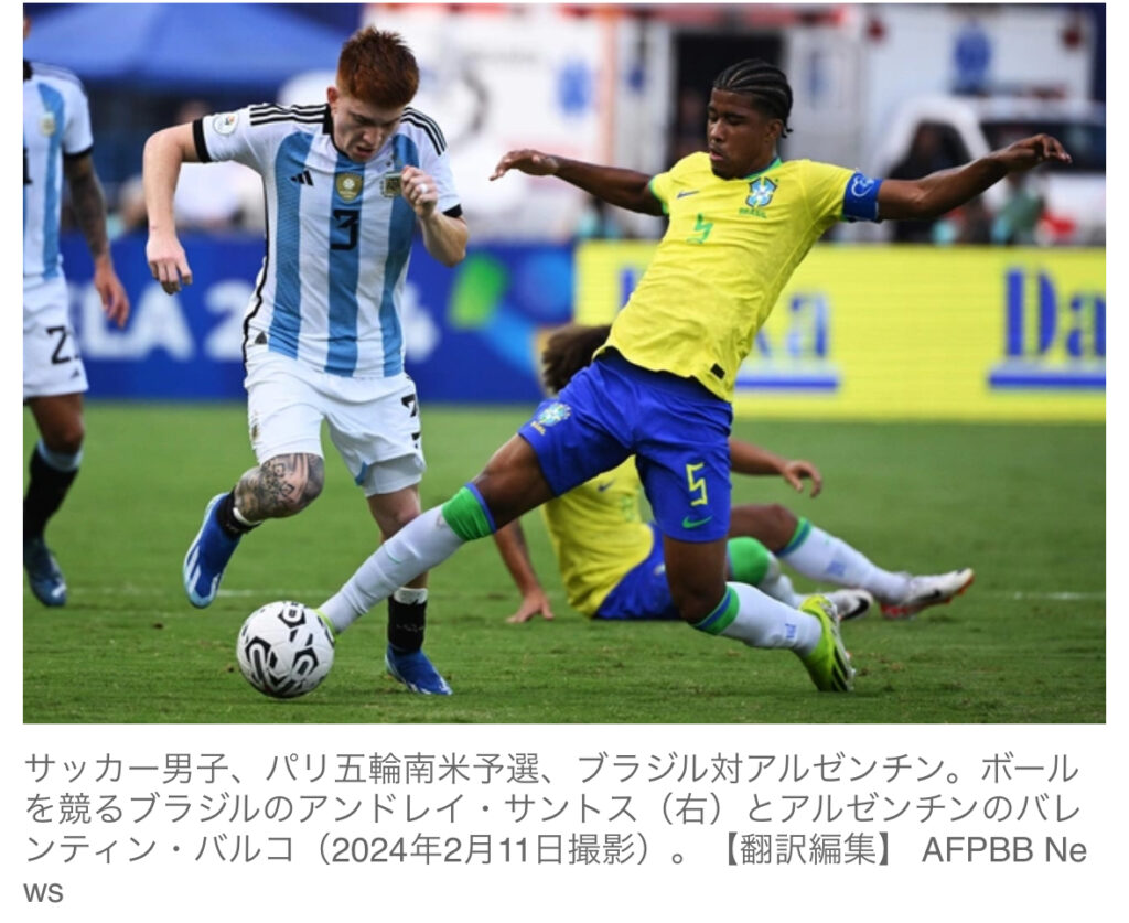 1: 久太郎 ★ 2024/02/12(月) 10:33:55.81 ID:8/K34ZNa9 【AFP=時事】サッカー男子のパリ五輪南米予選が11日、ベネズエラ・カラカスで行われ、ブラジルは0-1でアルゼンチンに敗れ予選敗退が決まり、五輪3連覇の夢が絶たれた。 【写真】五輪出場に歓喜する... -
