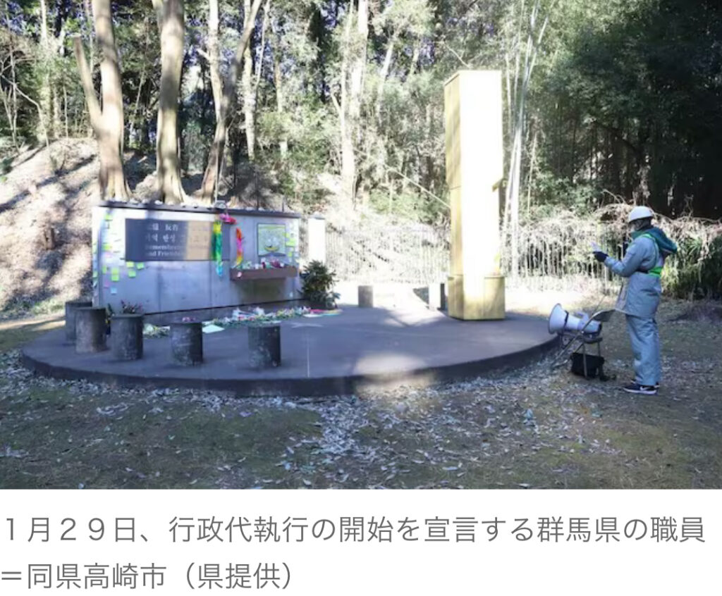 1: ばーど ★ 2024/02/01(木) 19:49:36.31 ID:+Gxzluf9 群馬県は1日、同県高崎市の県立公園「群馬の森」にある朝鮮人労働者追悼碑を撤去し、更地になっているとの一部報道について、「否定しない」との表現で事実上、認めた。県の代執行による撤去作業が始...