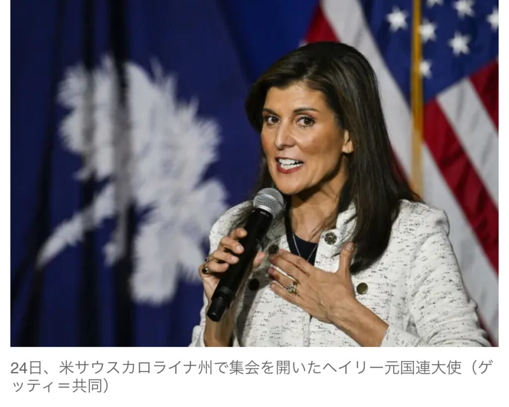1: 首都圏の虎 ★ 2024/01/25(木) 16:32:43.18 ID:vP1csBJx9 【ワシントン共同】米大統領選の共和党候補指名を争うヘイリー元国連大使は24日、地元の南部サウスカロライナ州で演説し、自身が第2戦の東部ニューハンプシャー州予備選で首位ドナルド・トランプ... -