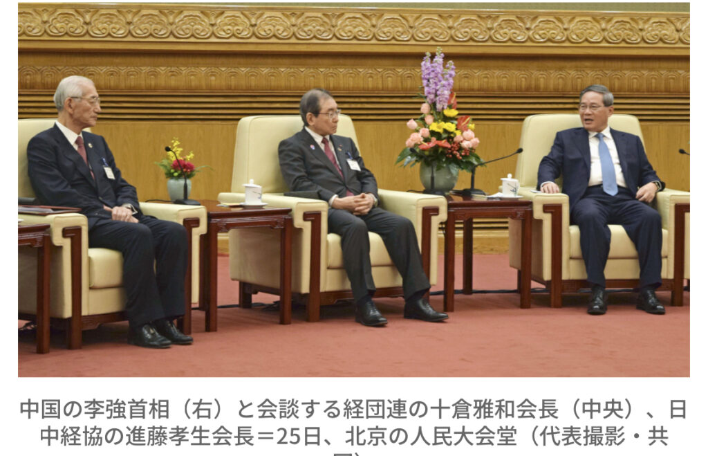 1: 蚤の市 ★ 2024/01/25(木) 16:35:14.89 ID:lbZeuRHc9 【北京共同】北京を訪問中の日中経済協会や経団連など経済界の代表団は25日、中国の李強首相と会談した。東京電力福島第1原発処理水の海洋放出に伴う日本産水産物の輸入停止措置の撤廃や、取り締ま... -