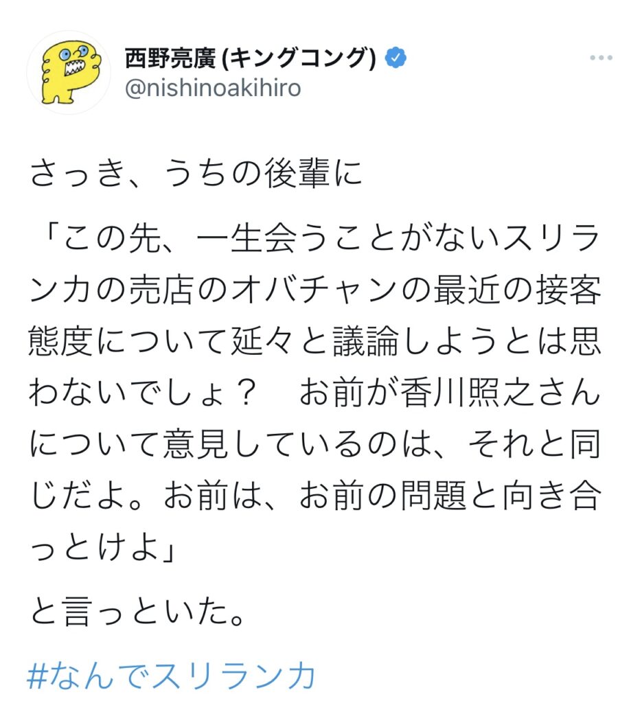 1: Anonymous ★ 2022/09/04(日) 16:44:38.33 ID:CAP_USER9 西野亮廣(キングコング) @nishinoakihiro (2022/09/03 10:40:52) さっき、うちの後輩に 「この先、一生会うことがないスリランカの売店のオバチャンの最近の接客態度について延々と議論しようとは... -