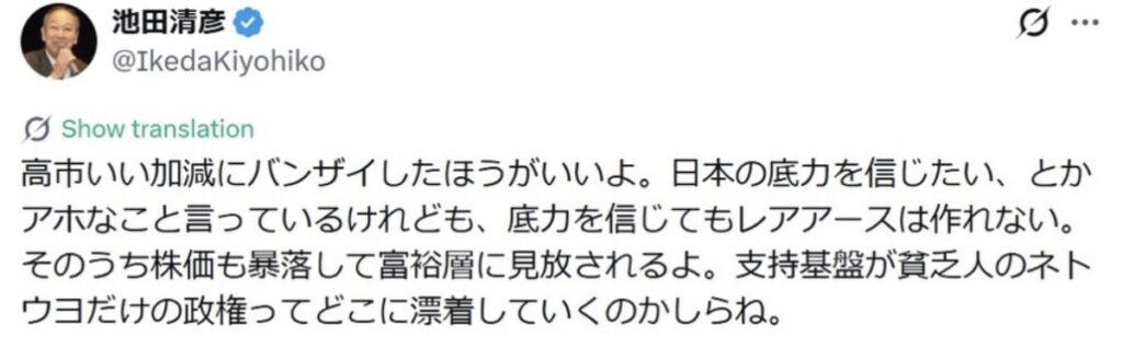 1: 鯨伯爵 ★ 2026/01/10(土) 07:22:57.91 ID:??? TID:gay_gay フジテレビ系「ホンマでっか!?TV」のコメンテーターとしても知られる生物学者で早稲田大学名誉教授の池田清彦氏が9日、X(旧ツイッター)を更新。日中関係の悪化を受け、高市早苗首相に“降参”... -