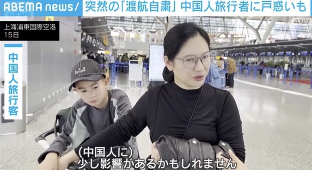 1: 1ゲットロボ ★ 2025/11/16(日) 14:12:07.83 ID:SUOcYsZF9 中国外務省が日本への渡航を控えるように注意喚起したことで、中国人の旅行者らにどのような影響が出るのか注目が集まっています。 中国人旅行客 「(中国人に)少し影響があるかもしれません...