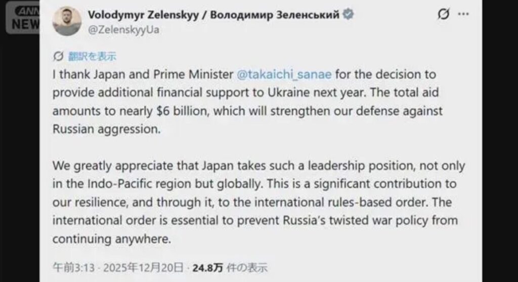 1: 尺アジ ★ 2025/12/20(土) 22:00:34.48 ID:zrL3PJ1Z9 ロシアによるウクライナ侵攻が続くなか、ゼレンスキー大統領は日本からの財政支援を巡って高市総理への感謝を表明しました。 ゼレンスキー大統領は19日、自身のSNSに「高市総理がウクライナに対する... -