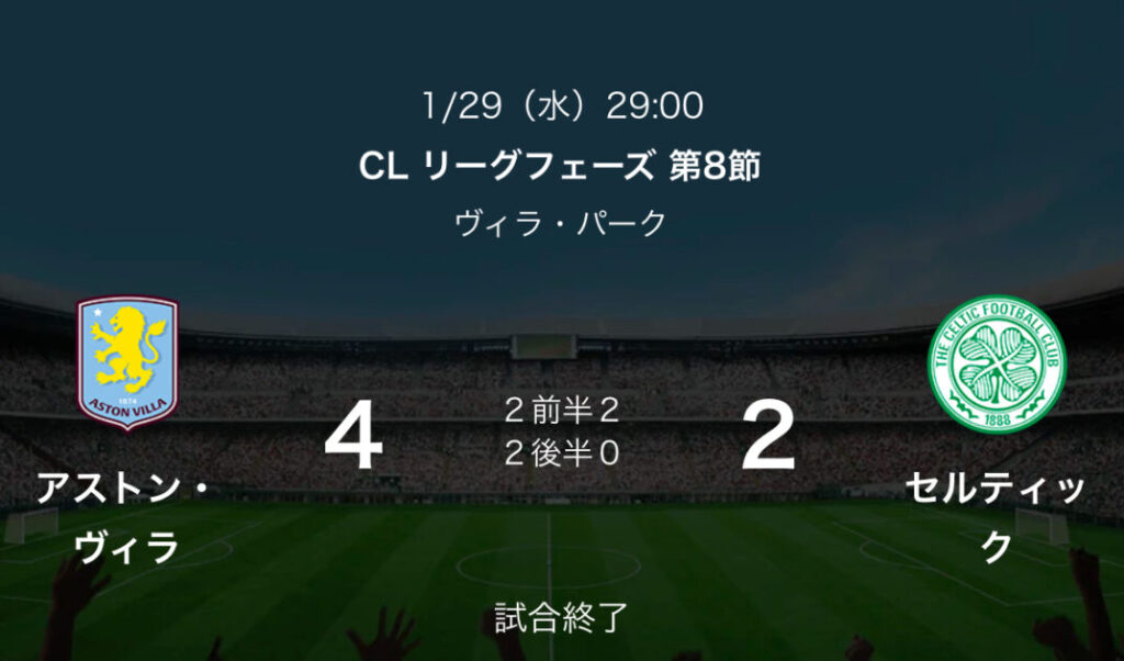 1: 久太郎 ★ 2025/01/30(木) 07:03:12.01 ID:bGqm0Cjh9 アストン・ビラ 4-2 セルティック [得点者] モーガン・ロジャース(前半03分)アストン・ビラ モーガン・ロジャース(前半05分)アストン・ビラ アダム・アイダ (前半36分)セルティック ... -