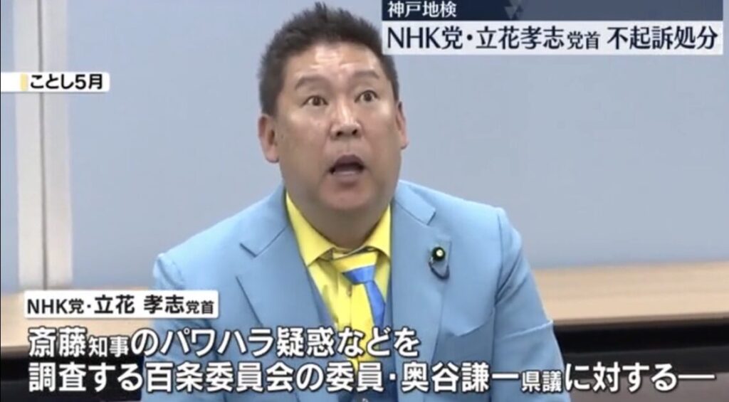NHK党・立花孝志党首を不起訴 県議への名誉毀損疑いなど