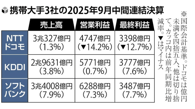 1: 蚤の市 ★ 2025/11/06(木) 21:51:44.07 ID:YCJFdvpr9 携帯電話大手3社の2025年9月中間連結決算(国際会計基準)は、KDDIとソフトバンクが増収増益となる一方、NTTドコモが2桁の減益となった。ドコモは顧客獲得や通信品質改善のための費用がかさみ、利益を... -