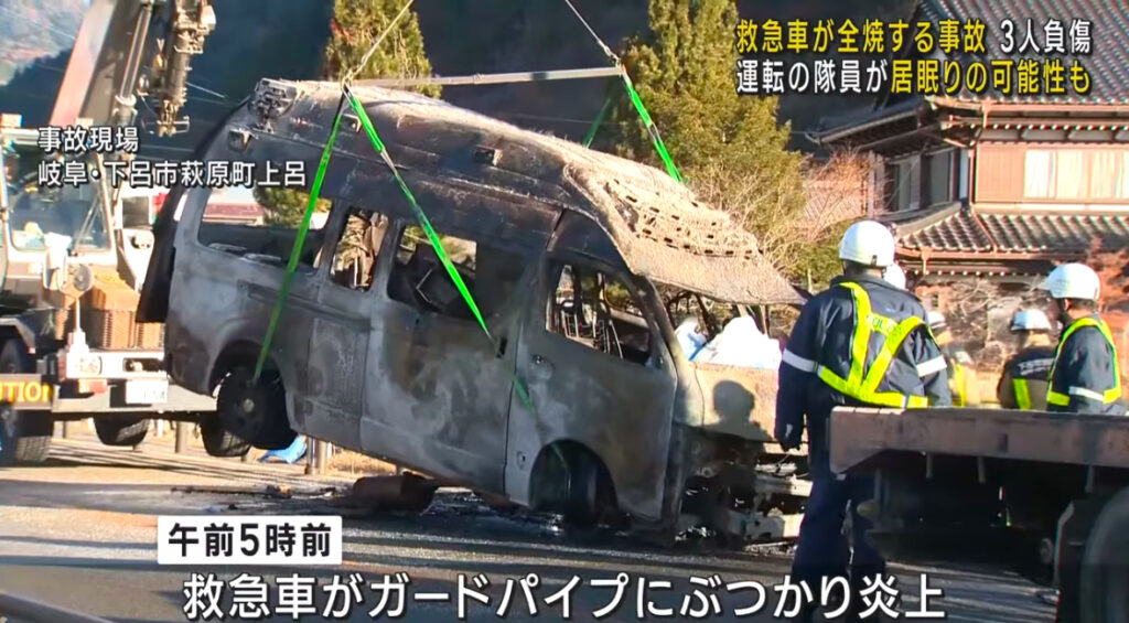 【社会】救急車がガードパイプに衝突し炎上、医師ら3人けが 24時間勤務で居眠り運転か 岐阜県下呂市