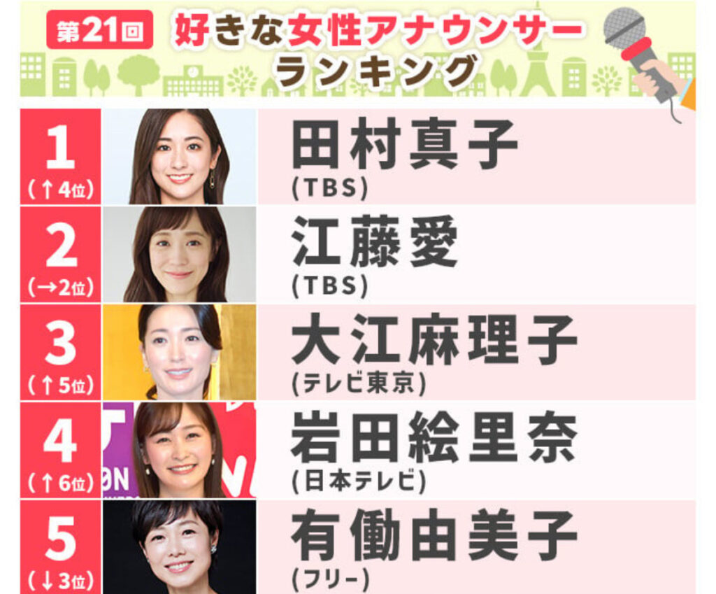 1: Ailuropoda melanoleuca ★ 2024/12/06(金) 09:10:38.87 ID:KrMVuQXm9 ORICON NEWSが発表している毎年恒例の『好きな女性アナウンサーランキング』、2023年はテレビ朝日の弘中綾香アナが3人目の殿堂入りを果たした。新たな首位は誰か注目が集まるなか... -