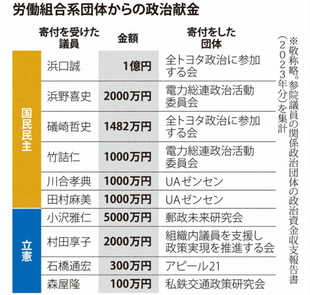 1: 蚤の市 ★ 2024/11/29(金) 19:13:13.31 ID:40Fzfxqc9 連合傘下の主要な労働組合や関連政治団体が、自ら擁立・支援する立憲民主党と国民民主党の参院議員に対し、2023年に計約2億4000万円を寄付したことが、29日に総務省が公表した政治資金収支報告書で... -