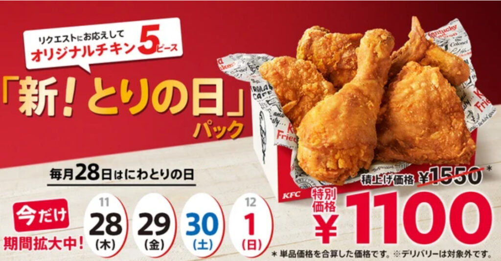 ケンタッキー・フライド・チキン「とりの日パック」オリジナルチキン5ピース 1100円で提供へ
