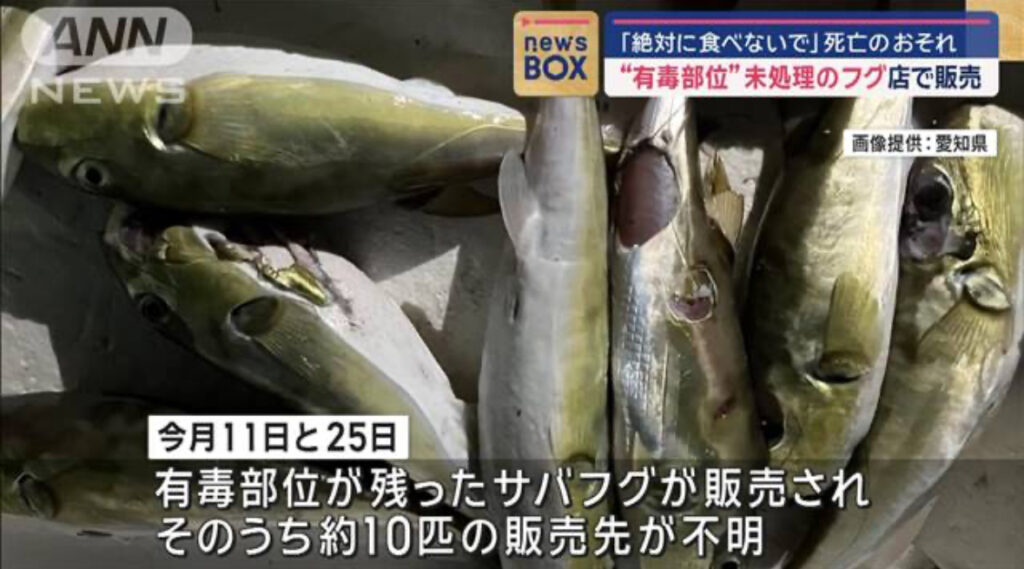 1: ちょる ★ 2024/11/26(火) 19:05:04.84 ID:??? TID:choru 愛知県常滑市の「竹朝ストアー」で今月11日と25日に有毒部位を取り除いていないサバフグが売られ、そのうち約10匹の販売先が分かっていないということです。 食べると死亡することもあり、県...