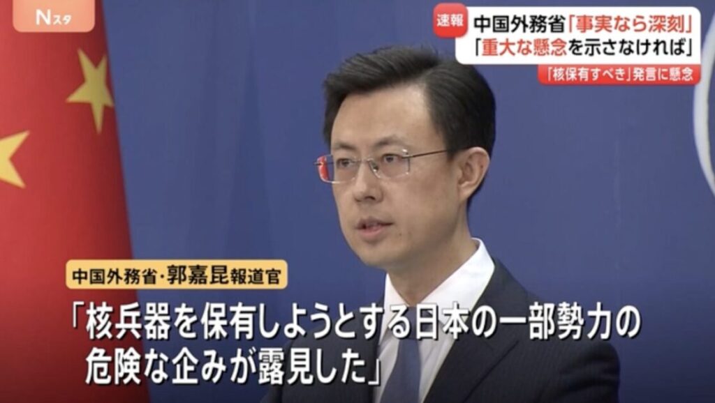 中国外務省「日本の核兵器保有という国際正義の一線を超える行為をやめなければならない」