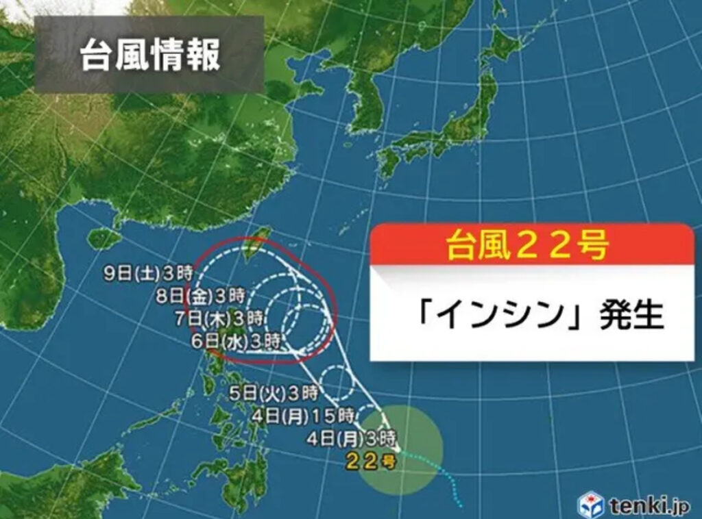 1: 牛乳トースト ★ 2024/11/04(月) 05:10:26.74 ID:Irl3DeSY9 4日(月)振替休日の午前3時、フィリピンの東で、台風22号「インシン」が発生しました。今後は発達しながら北上し、週の後半は沖縄県の先島諸島の南まで進んでくる可能性があります。 https://i-... -