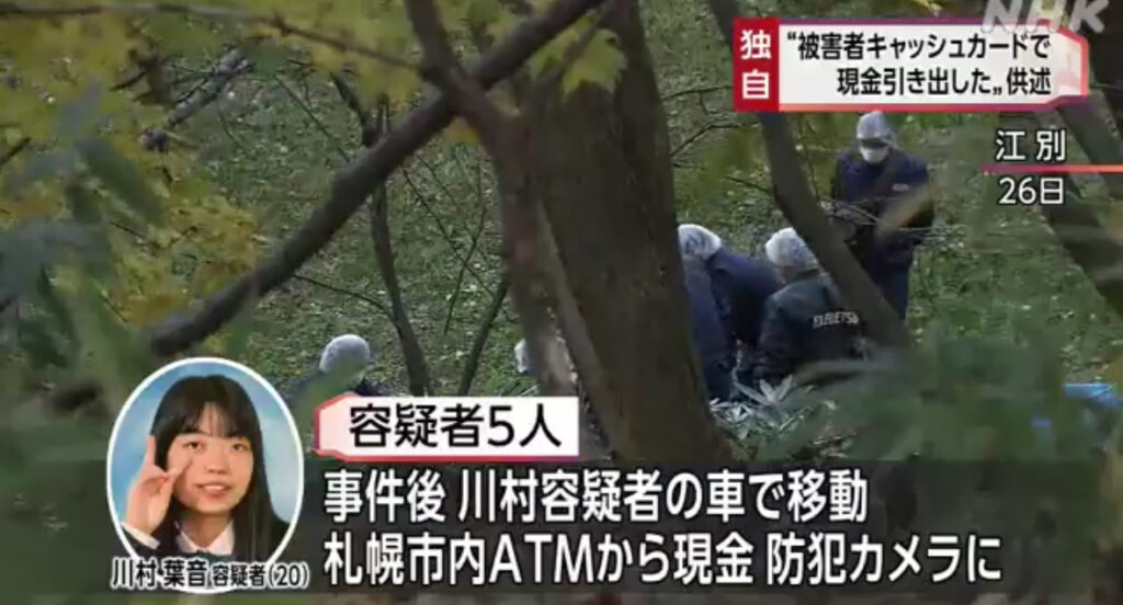 1: Hitzeschleier ★ 2024/10/31(木) 19:21:09.47 ID:02MLM6TT9 今月、江別市の公園で、20歳の男子大学生が暴◯されて死亡した事件で、逮捕された容疑者の数人が「被害者のキャッシュカードで現金を引き出した」という趣旨の供述をしていることが捜査関係... -