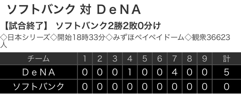 【野球】日本シリーズ第4戦 H 0-5 DB [10/30] DeNA2勝2敗に オースティン3安打2打点1HR、ケイ7回無失点 ホークス連敗