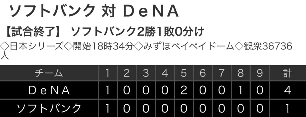 1: 鉄チーズ烏 ★ 2024/10/29(火) 22:11:54.00 ID:XlPIFzyf9 DeNA. 1 0 0 0 2 0 0 1 0 |4 ソフトバンク 1 0 0 0 0 0 0 0 0 |1 【バッテリー】 (De)東、伊勢、森原 - 戸柱 (ソ) スチュワート・ジュニア、... -