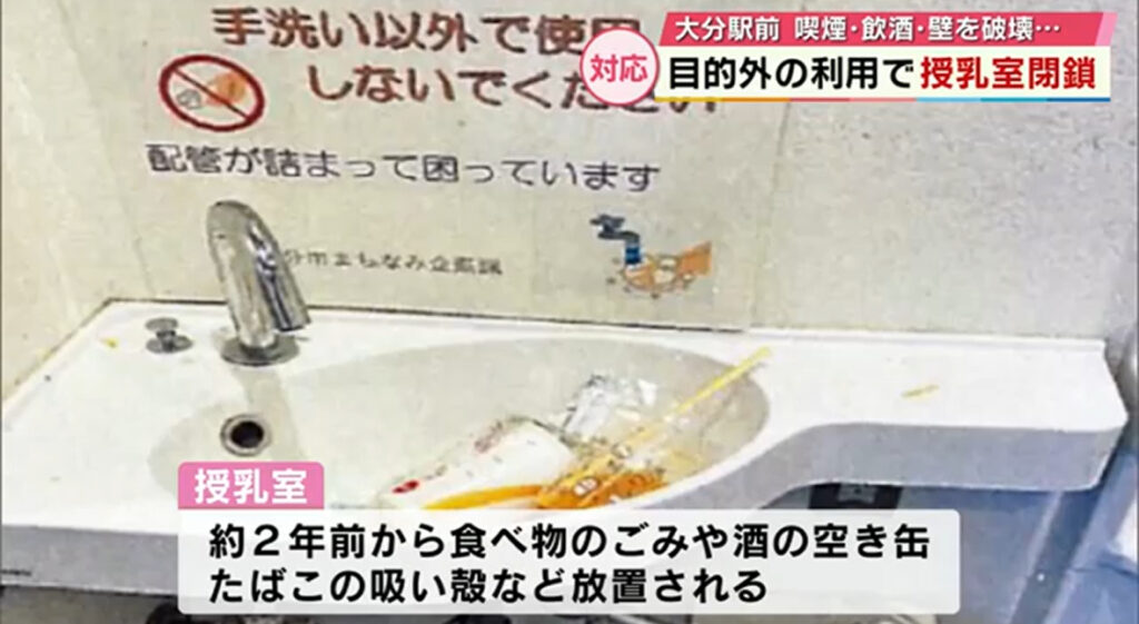 1: TUBASA ★ 2024/10/23(水) 22:47:15.35 ID:??? TID:TUBASA マナーを守らない人が増えたことで子育てにとって大事な施設が無くなりました。 大分駅前の広場に設置された授乳室が23日で閉鎖に。背景には喫煙や飲酒など悪質な利用が増えたことがありました... -