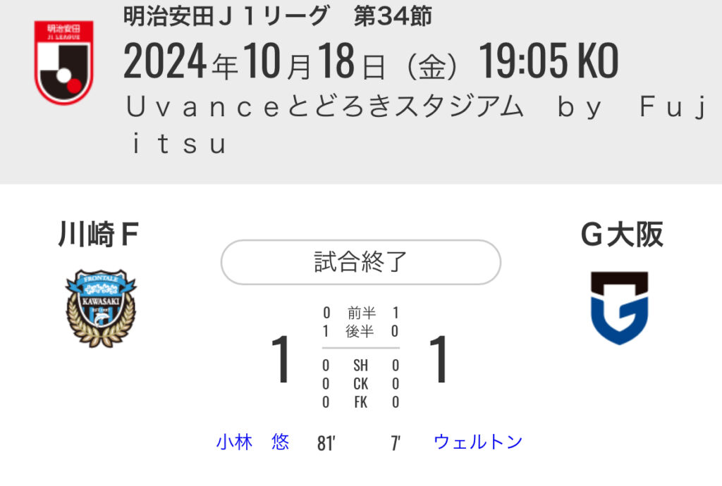 1: 久太郎 ★ 2024/10/18(金) 21:10:56.80 ID:FyM+CVpH9 川崎 1-1 G大阪 [得点者] 07'ウェルトン(G大阪) 81'小林 悠 (川崎) スタジアム:Uvanceとどろきスタジアム by Fujitsu 入場者数:19,982人 https://www.jleague.jp/matc...
