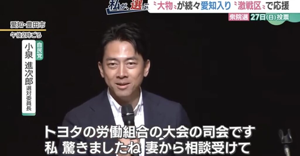 【愛知・応援演説】小泉進次郎氏「私には絶対に来ないオファーがうちの妻に来ました」明かす“トヨタの労働組合の大会の司会”