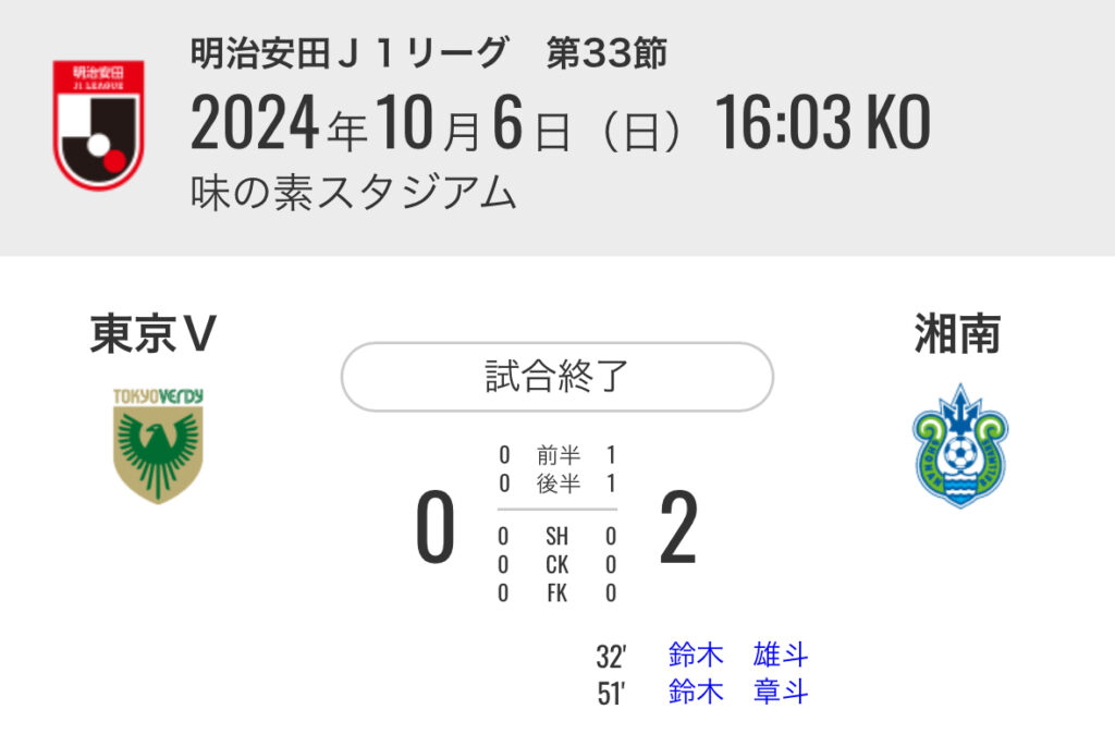 1: 久太郎 ★ 2024/10/06(日) 18:01:28.49 ID:dgXc1tKz9 東京V 0-2 湘南 [得点者] 32'鈴木 雄斗(湘南) 51'鈴木 章斗(湘南) スタジアム:味の素スタジアム 入場者数:19,010人 https://www.jleague.jp/match/j1/2024/100619/live/#live 磐田 1... -