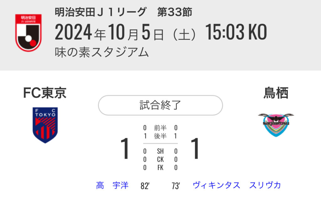 1: 久太郎 ★ 2024/10/05(土) 17:05:29.09 ID:pCaAgBir9 FC東京 1-1 鳥栖 [得点者] 73'ヴィキンタス スリヴカ(鳥栖) 82'高 宇洋 (FC東京) スタジアム:味の素スタジアム 入場者数:21,140人 https://www.jleague.jp/match/j1/2024/...