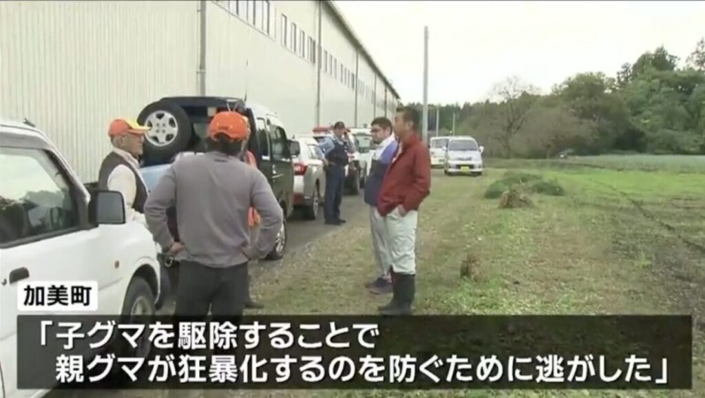 子グマを罠で捕らえる→助けに来た親グマが現場を離れる→子グマを解放