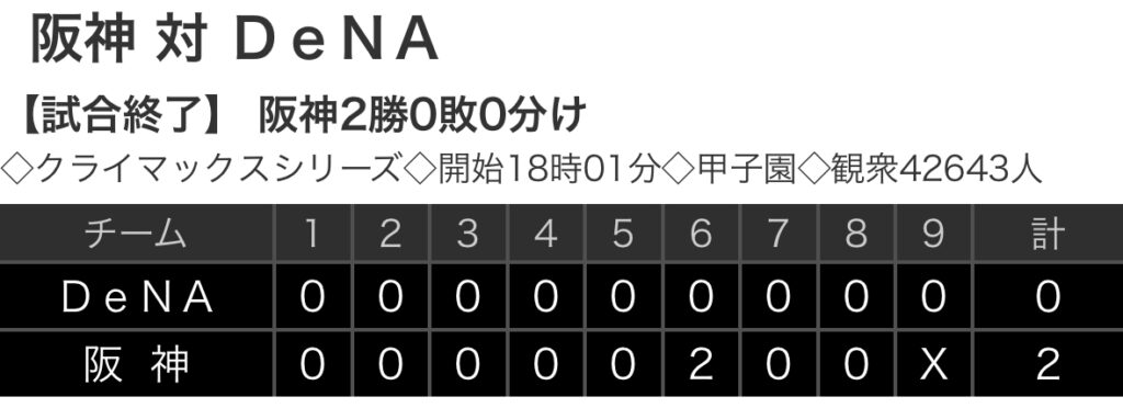 【野球】セ・リーグCS第1戦 T 2-0 DB [10/15] 阪神2勝0敗・村上,及川,石井,岩崎の完封リレー、森下、小野寺タイムリー DeNA12残塁