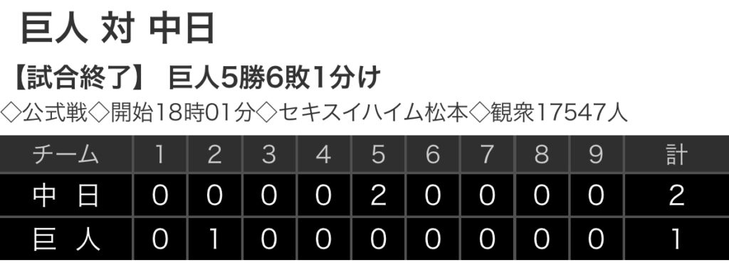 1: 鉄チーズ烏 ★ 2024/07/02(火) 20:56:26.56 ID:wFJ9ajq99 中日 0 0 0 0 2 0 0 0 0 |2 巨人 0 1 0 0 0 0 0 0 0 |1 【バッテリー】 (中)小笠原、清水、松山、マルティネス - 木下 (巨)山﨑伊、船迫、高梨、泉 - ...