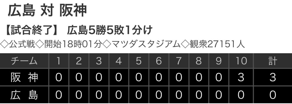 1: 鉄チーズ烏 ★ 2024/07/02(火) 21:47:48.12 ID:wFJ9ajq99 阪神 0 0 0 0 0 0 0 0 0 3 |3 広島 0 0 0 0 0 0 0 0 0 0 |0 【バッテリー】 (阪)才木、石井、桐敷、岩崎、ゲラ - 梅野 (広)森下、栗林、島内 - 會... -