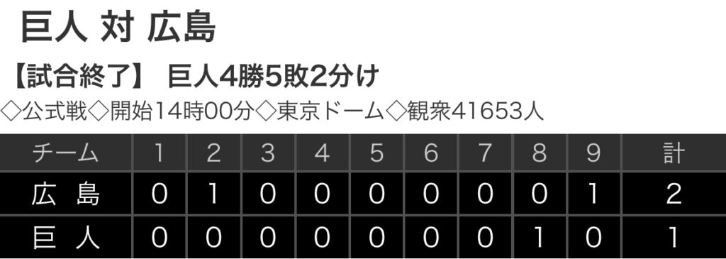 1: 鉄チーズ烏 ★ 2024/06/29(土) 16:47:27.15 ID:WV7Te8FX9 広島 0 1 0 0 0 0 0 0 1 |2 巨人 0 0 0 0 0 0 0 1 0 |1 【バッテリー】 (広)大瀬良、塹江、森浦、島内、栗林 - 會澤 (巨)グリフィン、バルドナード - ... -