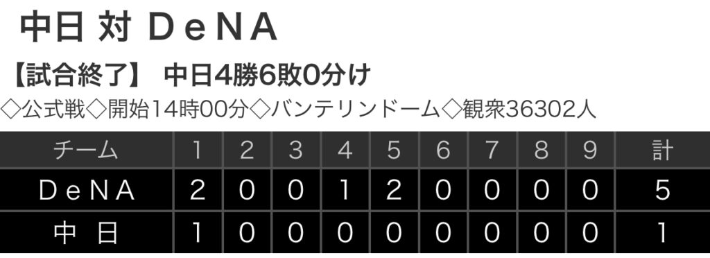 1: 鉄チーズ烏 ★ 2024/06/29(土) 16:40:12.35 ID:WV7Te8FX9 DeNA 2 0 0 1 2 0 0 0 0 |5 中日 1 0 0 0 0 0 0 0 0 |1 【バッテリー】 (De)東、徳山、ウイック - 山本 (中) 大野、フェリス、橋本、祖父江、... -