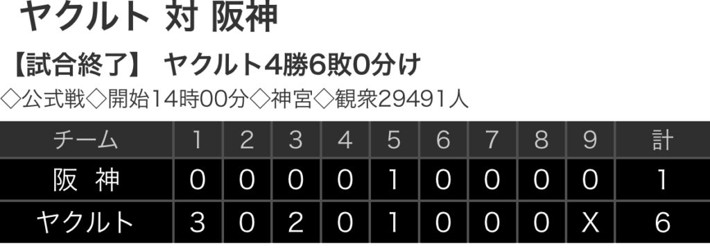 1: 鉄チーズ烏 ★ 2024/06/29(土) 17:13:21.16 ID:WV7Te8FX9 阪神 0 0 0 0 1 0 0 0 0 |1 ヤクルト 3 0 2 0 1 0 0 0 x |6 【バッテリー】 (阪)伊藤将、浜地、富田、島本 - 坂本 (ヤ)奥川、星、石山、小澤、清水... -