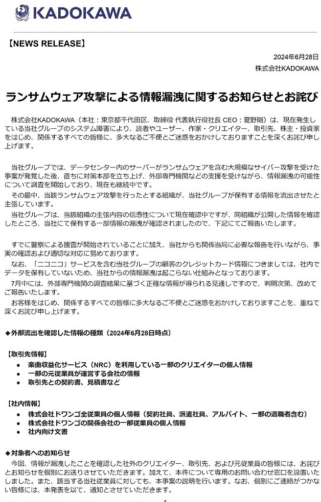 KADOKAWA、クリエイターの個人情報漏えいを確認 ドワンゴ全従業員の個人情報、取引先との契約書、社内向け文書なども