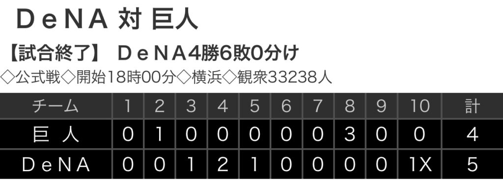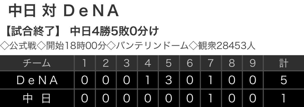 1: 鉄チーズ烏 ★ 2024/06/28(金) 20:38:18.40 ID:+Hk4LF8W9 DeNA 0 0 0 1 3 0 1 0 0 |5 中日 0 0 0 0 0 0 1 0 0 |1 【バッテリー】 (De)ジャクソン、佐々木 - 山本 (中) 高橋宏、祖父江、フェリス、勝野... -