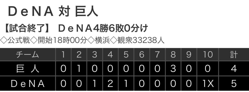 1: 鉄チーズ烏 ★ 2024/06/27(木) 21:37:41.55 ID:WR5Lanyc9 巨人 0 1 0 0 0 0 0 3 0 0 |4 DeNA 0 0 1 2 1 0 0 0 0 1x |5 【バッテリー】 (巨) 井上、赤星、平内、泉、高梨、ケラー - 岸田 (De)平... -