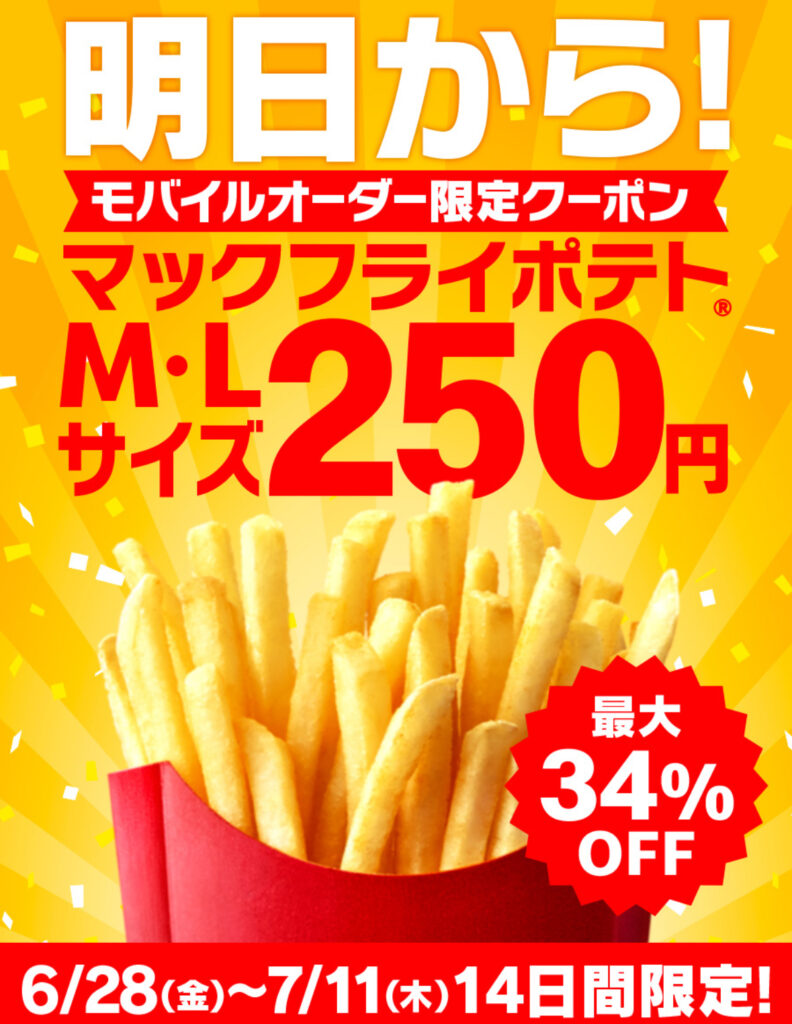 マクドナルド、28日からマックフライポテトLが250円 モバイルオーダーで